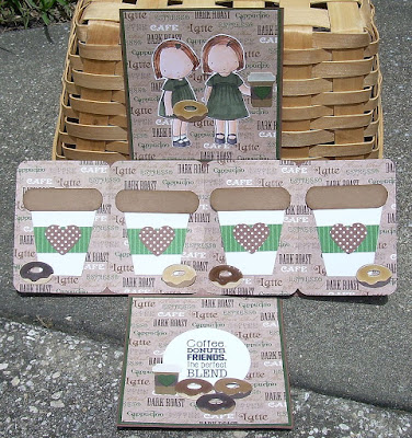 I used a lot of different techniques on this card. I stamped, colored with Copics, used my Big Kick to die cut the donuts and mini coffee cups, paper punched hearts.....what I didn't get to do was use pop up dots. If you follow me, you will know how much I love pop up dots and put them on everything. But due to the style of this card, I didn't think that they would fit, once I twisted it back together.